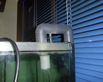 水槽へもどすU字管は、水流を止めたときにサイフォンにならないように、穴をあけてエアーチューブを通し、空気が入るようにしました。ポンプが止まり水位が下がると、エアーチューブから空気が逆流することになります。屋外配管を変更するときもできるだけ管内の水が出ないよう、屋外からの配管と水槽へのU字管の間にボールバルブを入れました。後にクーラー設置の場合にこのバルブとポンプの両端のバルブをしめて海水が流れ出ないようにします。