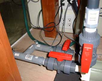 前述したように、はじめからこの場所に水槽を置く予定でしたので、給水用の蛇口と、排水用の排水口をつけてありますが、サンプからポンプへつなぐ配管を分岐し、ボールバルブを介して排水口に流れるようにしてあります。サンプ内の海水のみであれば、ポンプへのバルブを閉め、排水口へのバルブをあけることによって、簡単に排水できます。ナチュラルシステムでの通常の水換えは、サンプ程度(全水量400L程度のうち、高々約100Lぐらいまで)で十分ですので、この排水のしくみは重宝するはずです。今までは、長いホースをつかっていましたので、随分と楽になるはずです。