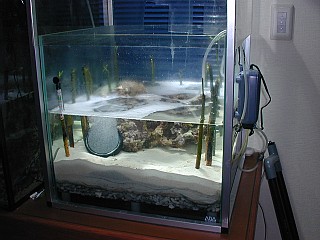 水槽の水を砂の表面まで抜き、一旦ライブロックを出して、サンゴ砂を追加しました。通常のパウダーサンゴ砂です。厚さは、約5cm。プレナムと、サンゴ砂LLとを合わせると、トータルで15cm ほどになりました。やけに浅い水槽になりそうです。左の写真は、砂を追加したあとに、ライブロックを置き、マングローブの種を植えたところです。横から見たところ。砂の層が厚いのがわかります。 隣のベルリン水槽から、海水をもらって入れました。実は、一週間ほど前に、天然海水で水換えをしたところです。パウダーサンドは、一応真水であらってから入れましたが、まだ濁っています。 上からみたところ。マングローブは、若干葉が出ていますが、これは既に買ってきたときから出ていた分。ちゃんと根が出てから、成長するので、しばらくはこのままでしょう。 (2000/4/16)